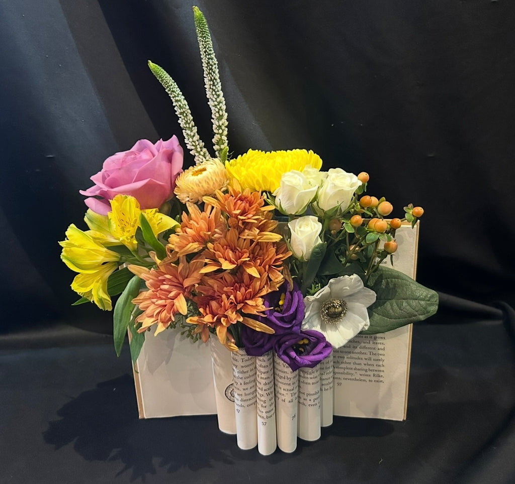 Perfect for any book lover! Fresh or dried, these flowers arranged in a book seem to be bursting from the pages! Please specify fresh or dried, colors, flowers desired, etc in the notes to florist.