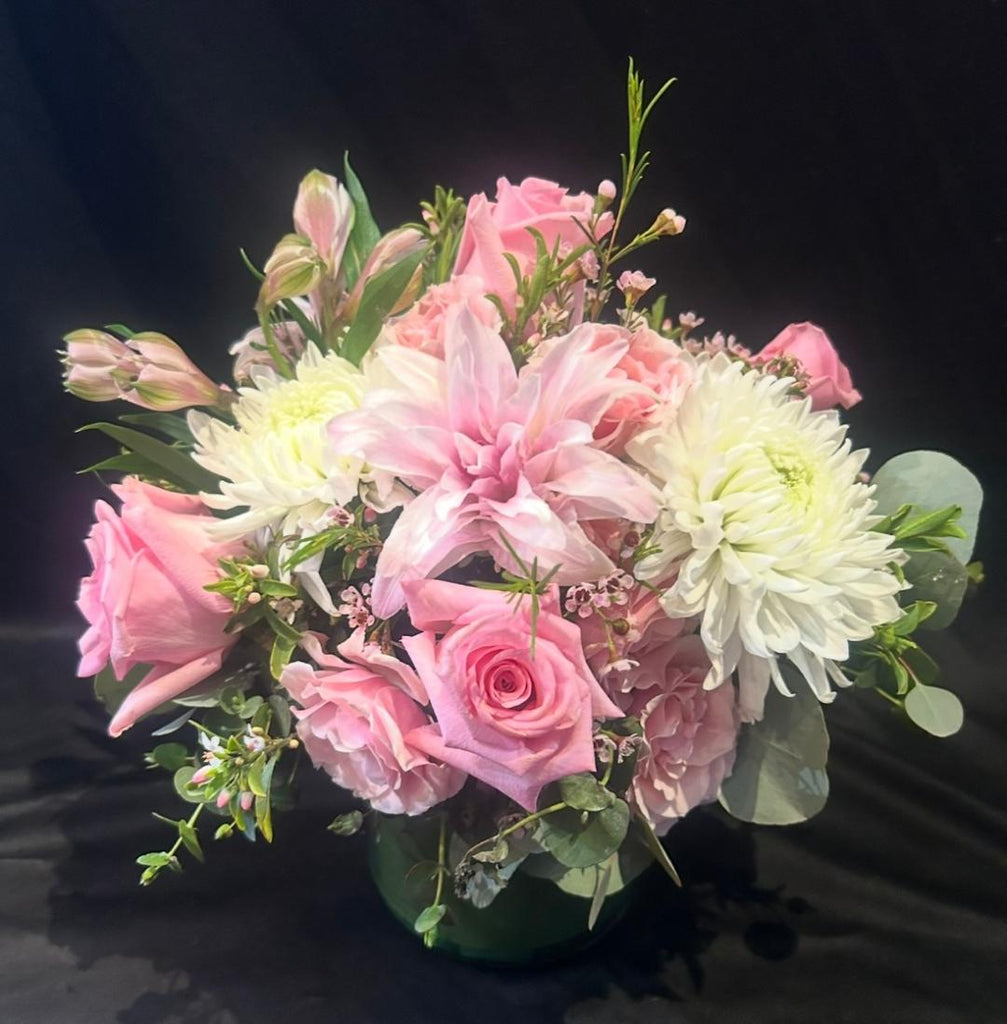 Pretty pastel pinks of lilies, roses, spray roses, and other blooms with a hint of eucalyptus. What a sweet treat!