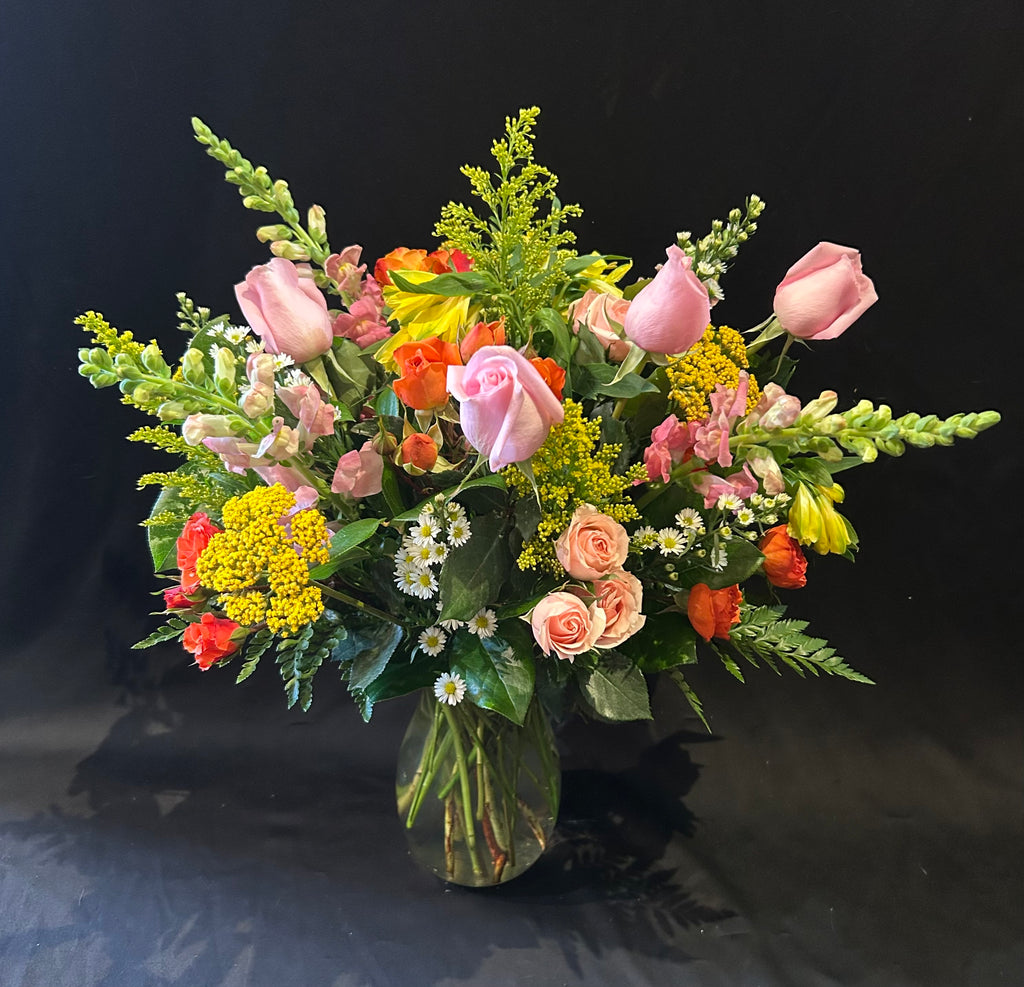 Pretty pinks and yellows are included in this joyous arrangement that will make you want to sing! Roses, spray roses, snapdragons, solidago, alstroemeria, and monte casino included. Please specify if there is something you would like included as some substitutions may apply.