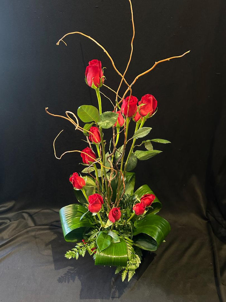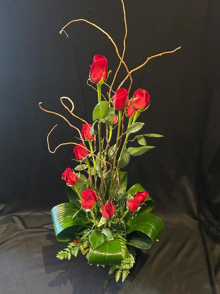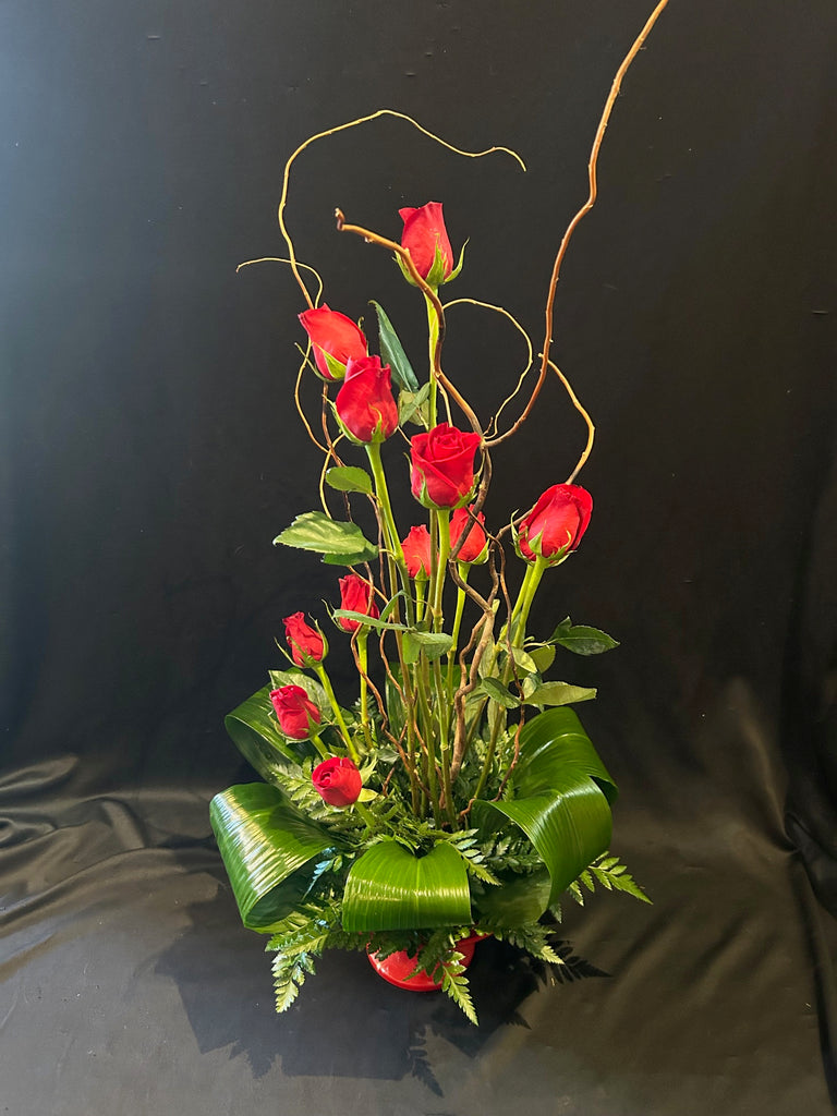 This whimsical arrangement displayed as a spiral of a dozen roses is sure to impress anyone with an artful eye! It is accented with looped aspidistra leaves and curly willow in a fun red container. Sophisticated. Elegant. Unique. One of a kind.