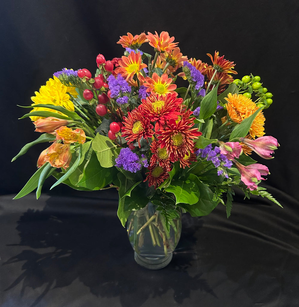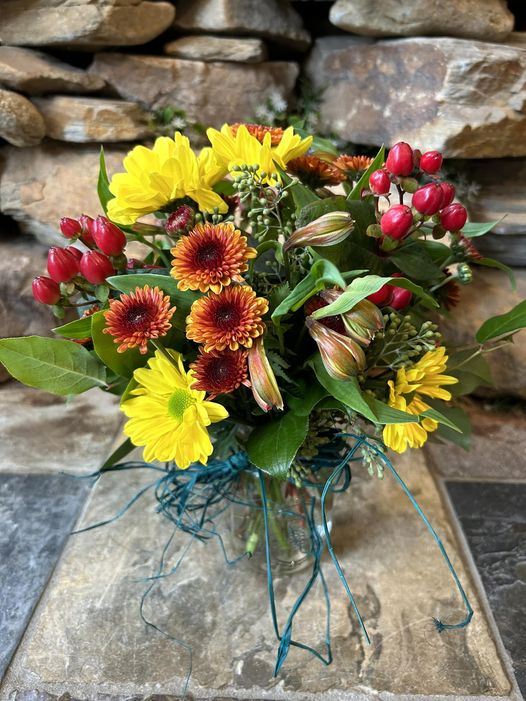 Tis the season for all things autumn with reds, yellows, and orange hues. This sweet little thing has hypericum berries, mums, alstroemeria, daisies, and seeded eucalyptus filling a ball jar and tied off with some raffia.