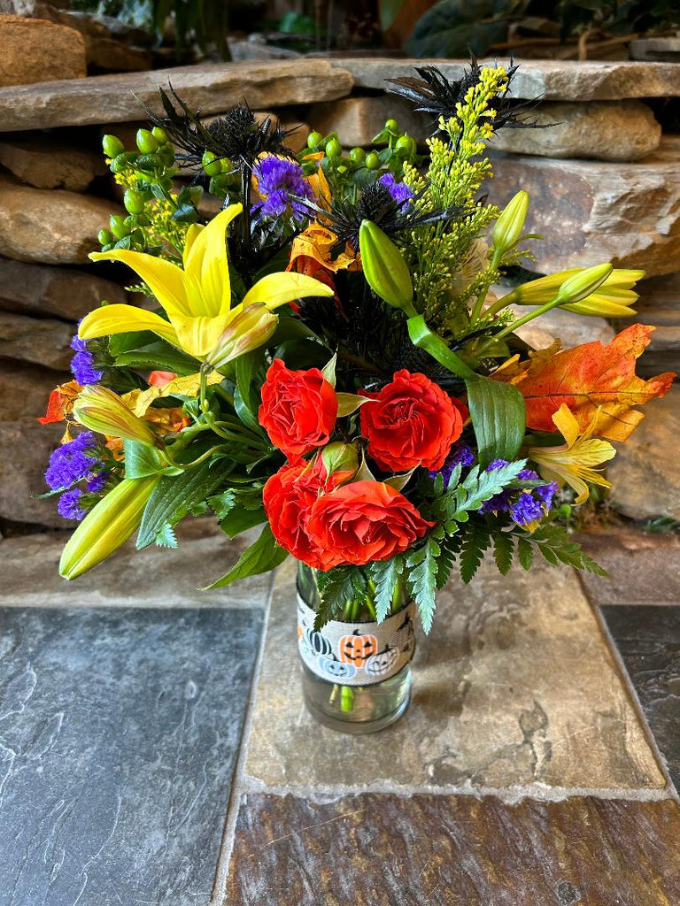 A seasonal mix of lilies, spray roses, alstromeria, hypericum berries, and spooky black thistle adorned with a not-so-spooky Halloween ribbon. Cats and pumpkins, oh my! Faux fall leaves added for that special touch of autumn!